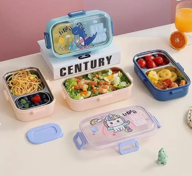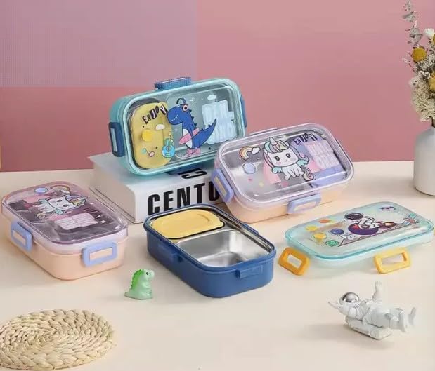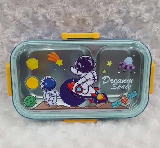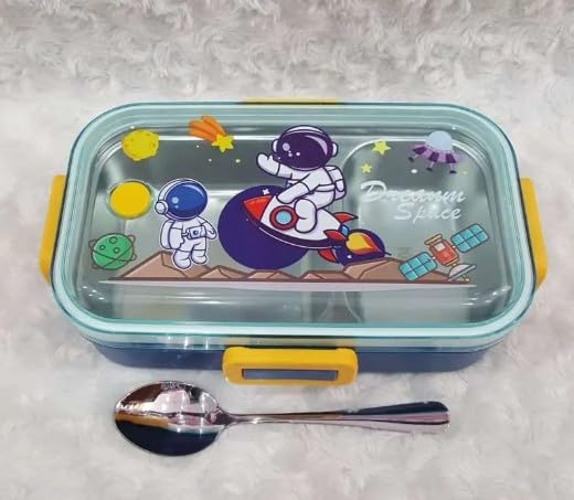 RAYCRAFT WORLD 3 pc 2 Partition 700ml Kids Lunch Box with Design, Leakproof Bento Box, Spoon & Container with Lid