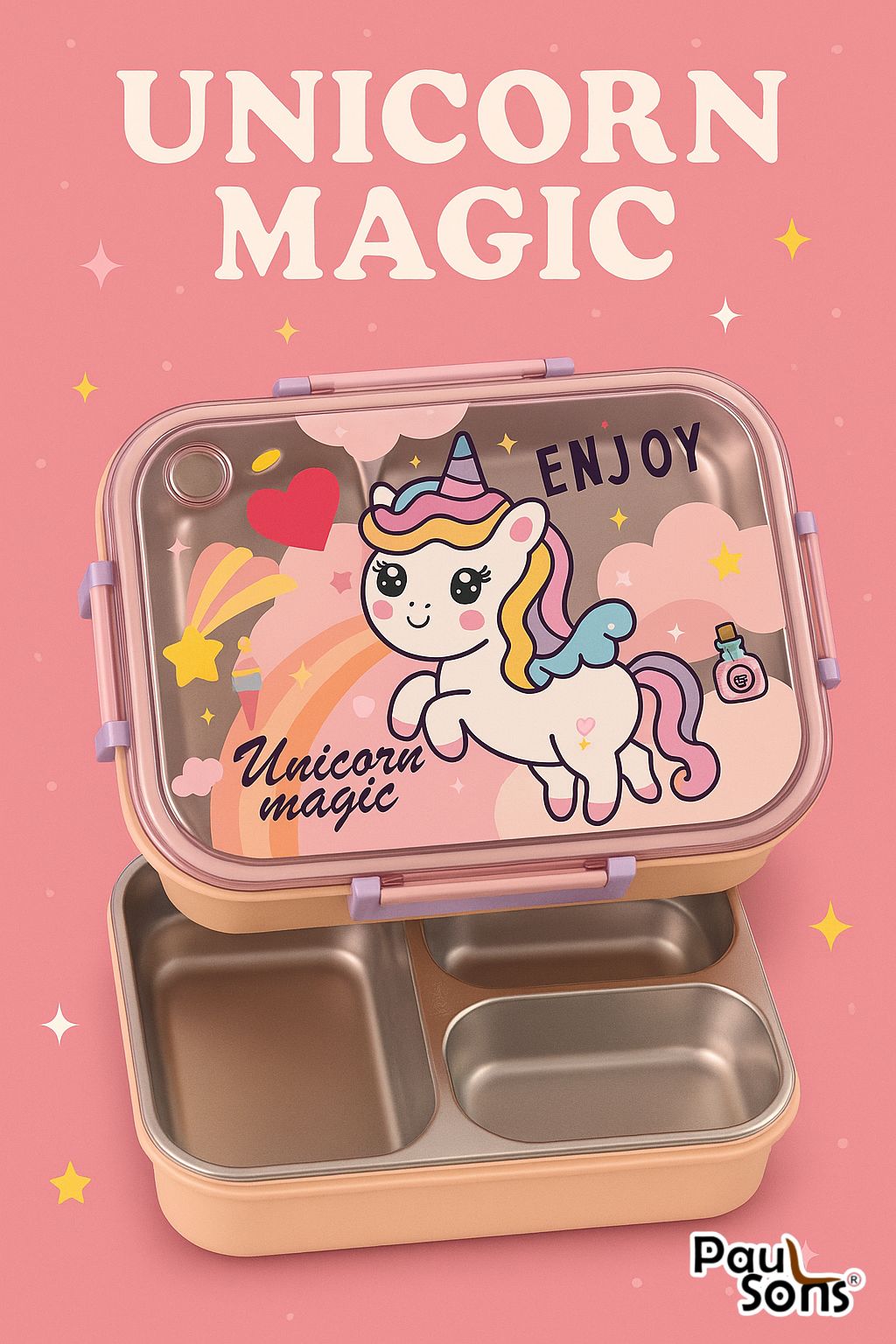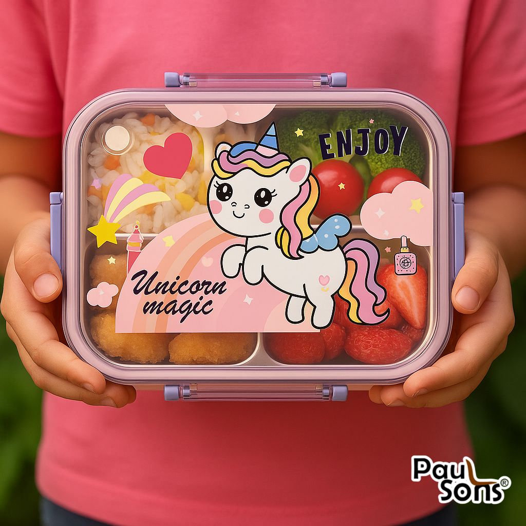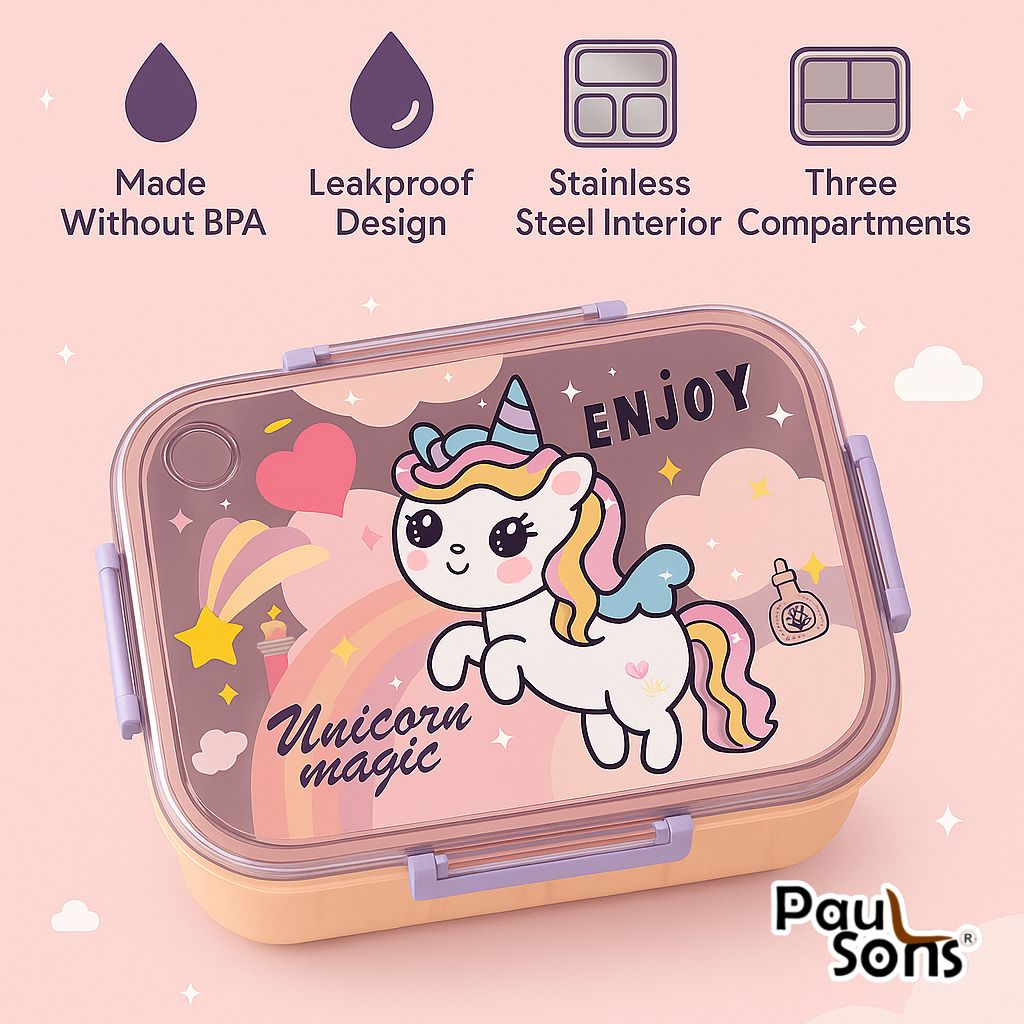 RAYCRAFT WORLD Peach Color Unicone Print 3 pc 3 Partitions 750ml Kids Lunch Box with Design, Leakproof Bento Box, Spoon, Chopsticks & Container with Lid