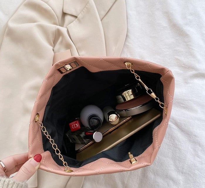 Elevate your style with this sophisticated quilted shoulder bag that exudes timeless elegance. The classic peach PU leather exterior features precise diamond quilting that adds texture and visual interest. The bag is adorned with luxurious gold-tone hardware, including a refined turn-lock clasp that secures your belongings with style. The dual chain straps in matching gold tone add a touch of glamour while providing versatile carrying options. Perfect for both day and evening occasions, this spacious handbag offers ample room for your essentials while maintaining a sleek silhouette. The quilted design and chain details pay homage to iconic fashion houses, making this an ideal choice for fashion-conscious individuals seeking a blend of sophistication and practicality. The durable PU leather construction ensures the bag maintains its shape and beauty through regular use, while being easy to maintain. Whether paired with formal attire or casual ensembles, this handbag serves as a stunning accessory that complements any wardrobe.