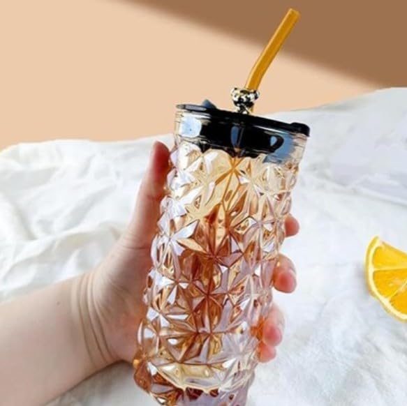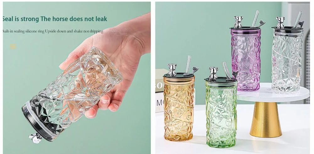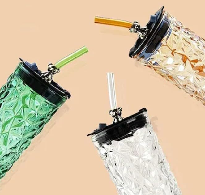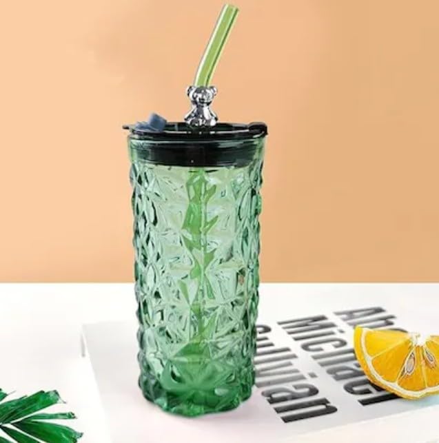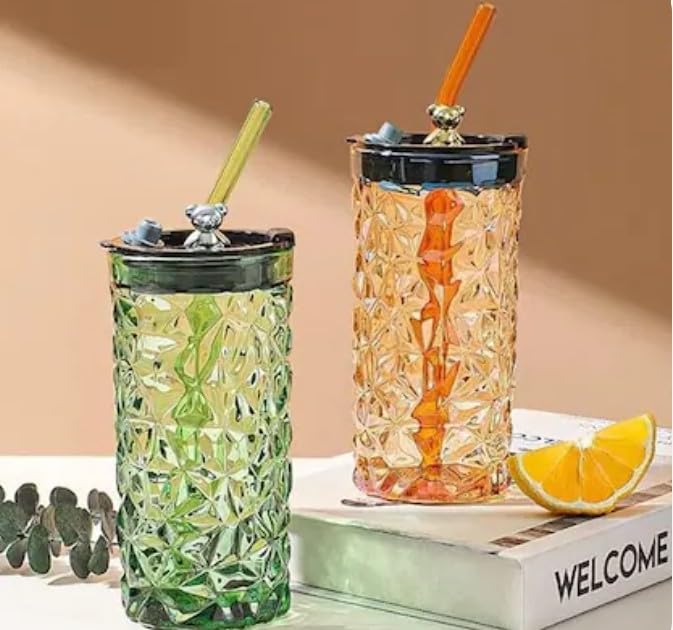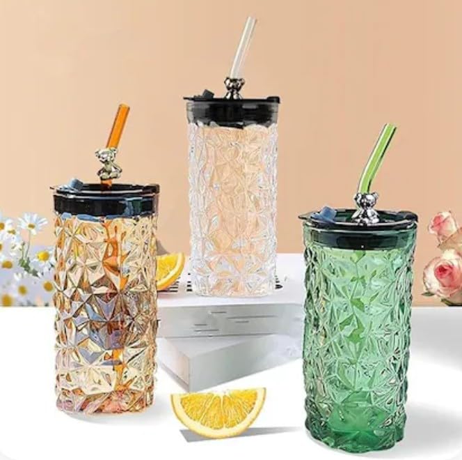 RAYCRAFT WORLD Vintage Glass Tumbler with Straw 500ml Attractive Crystal Pattern with Teddy Reusable Lid