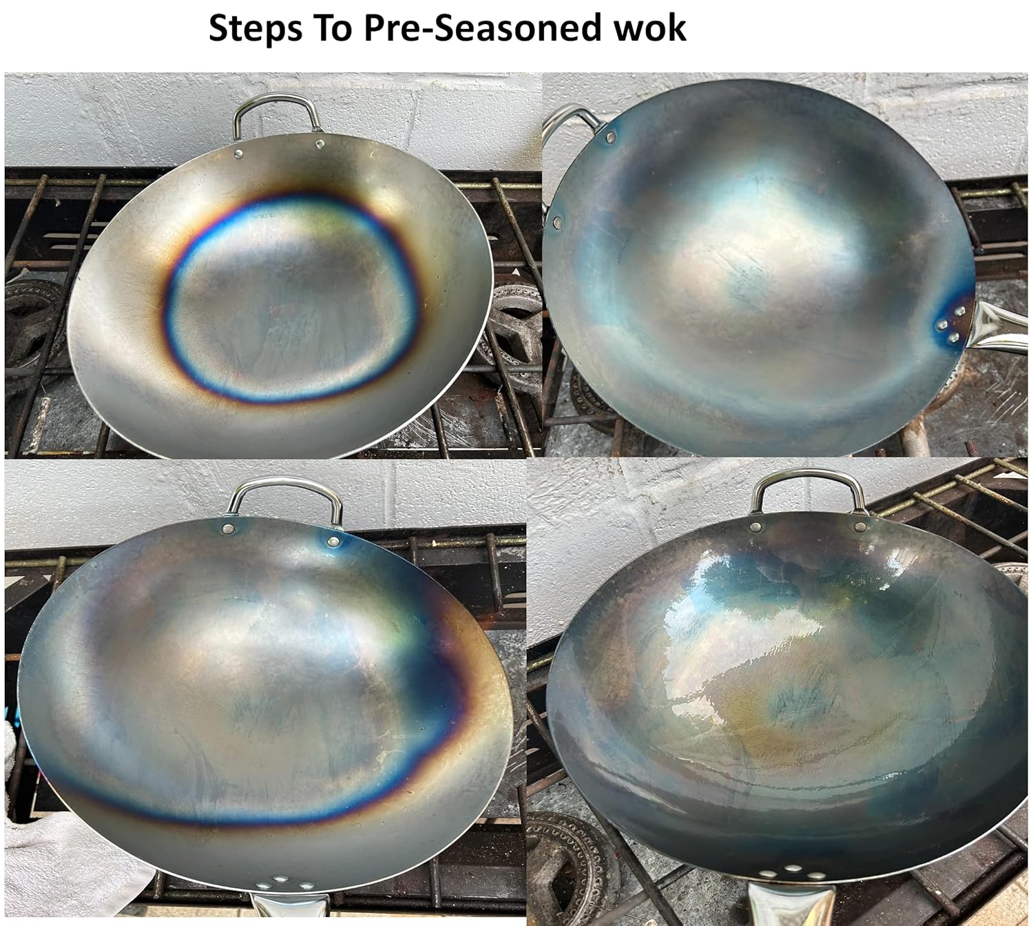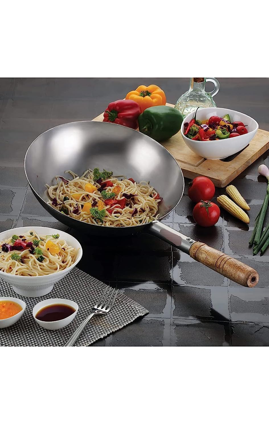 - SITUABLE FOR DIVERSE CARPET WAYS: This wok guarantees fast, efficient heating and exceptional heat transfer. Stir pan can be used in various cooking methods, such as frying pan, braising, boiling, steaming, frying and so on. This Chinese wok can make more Asian food.